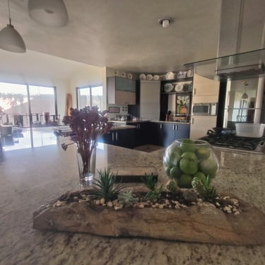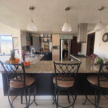 Cocina Gourmet de Gran Escala: El sueño de cualquier chef. Equipada con electrodomésticos de alta gama, barra desayunadora, una alacena y vistas panorámicas a los jardines que rodean la casa.