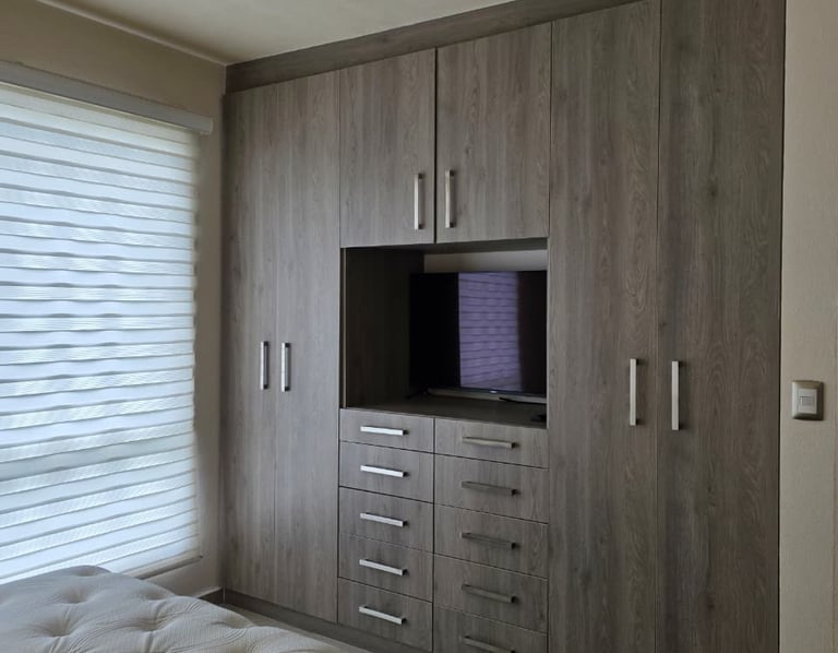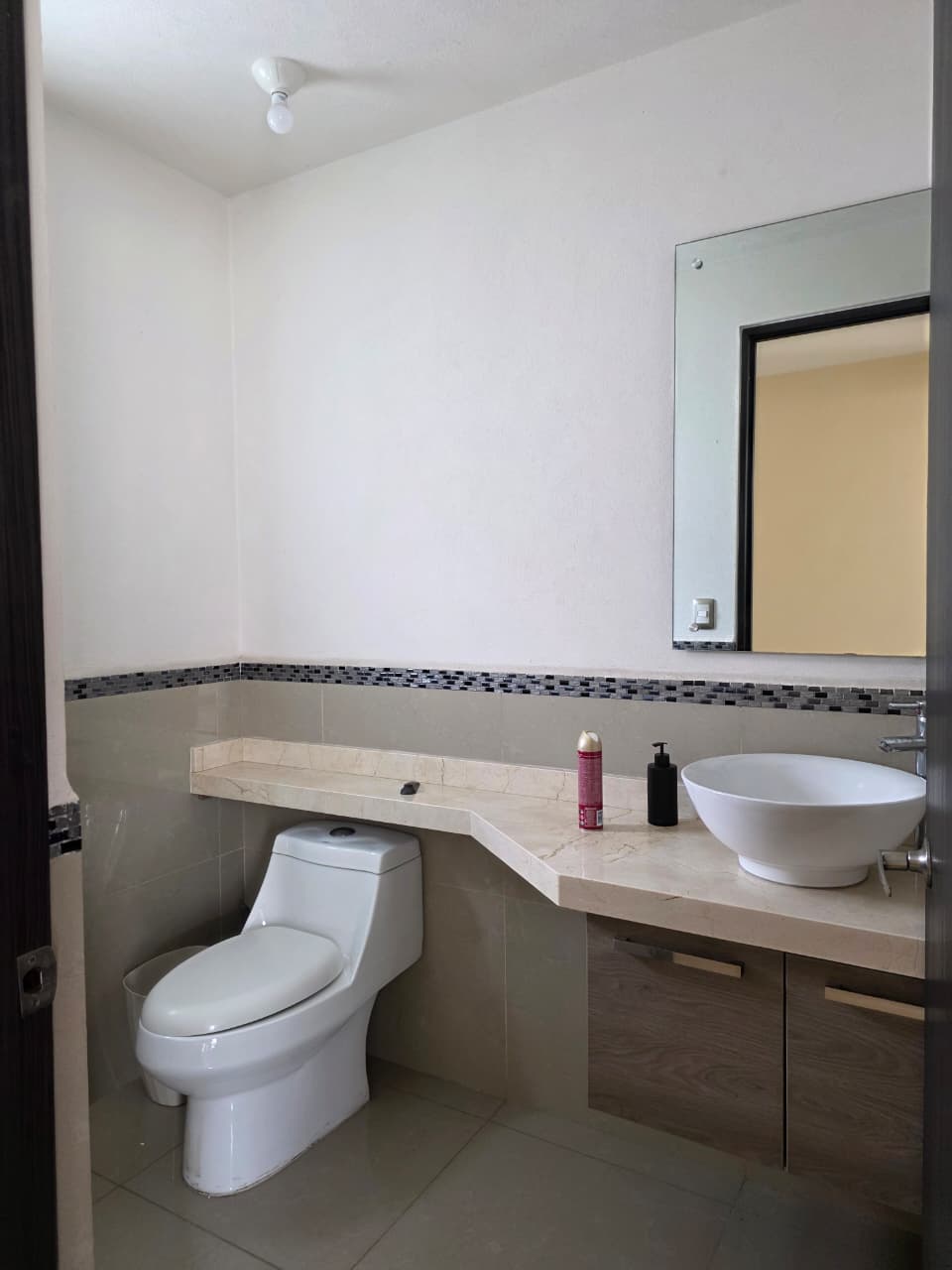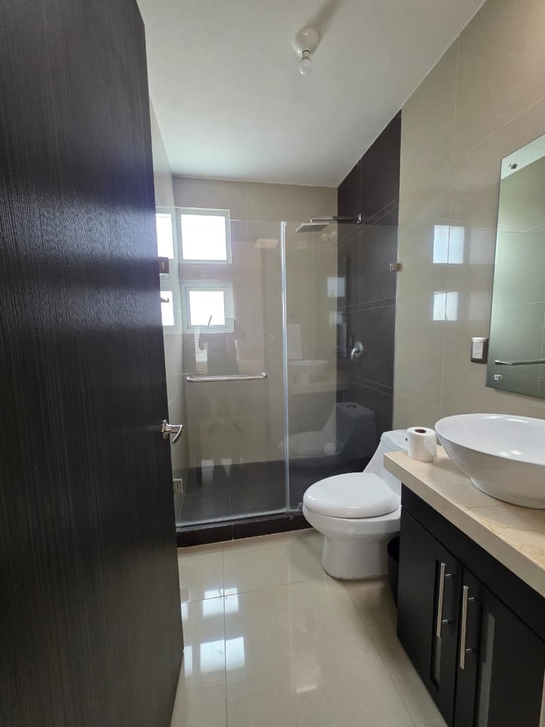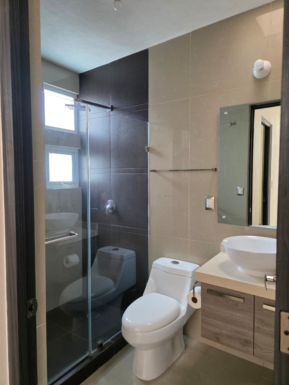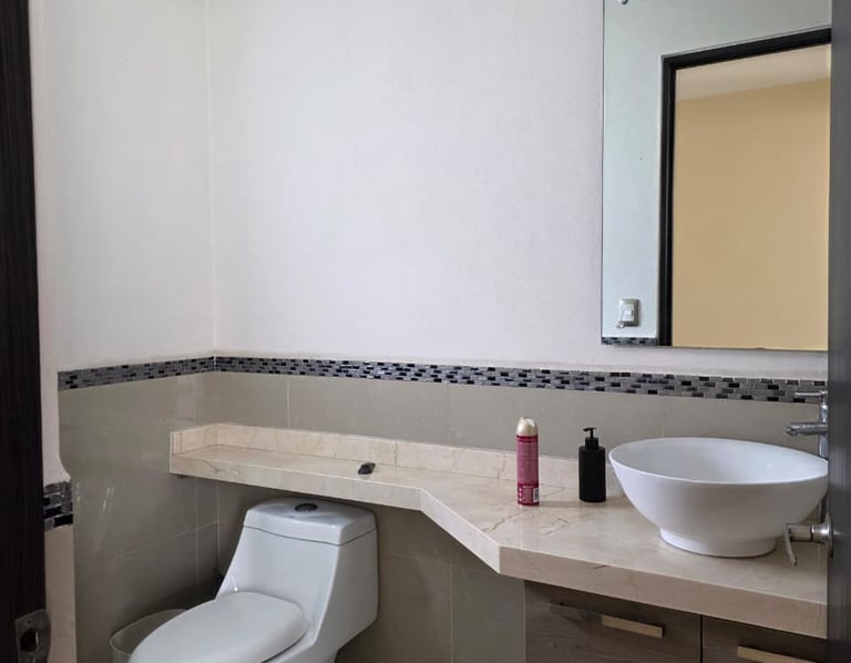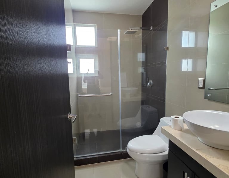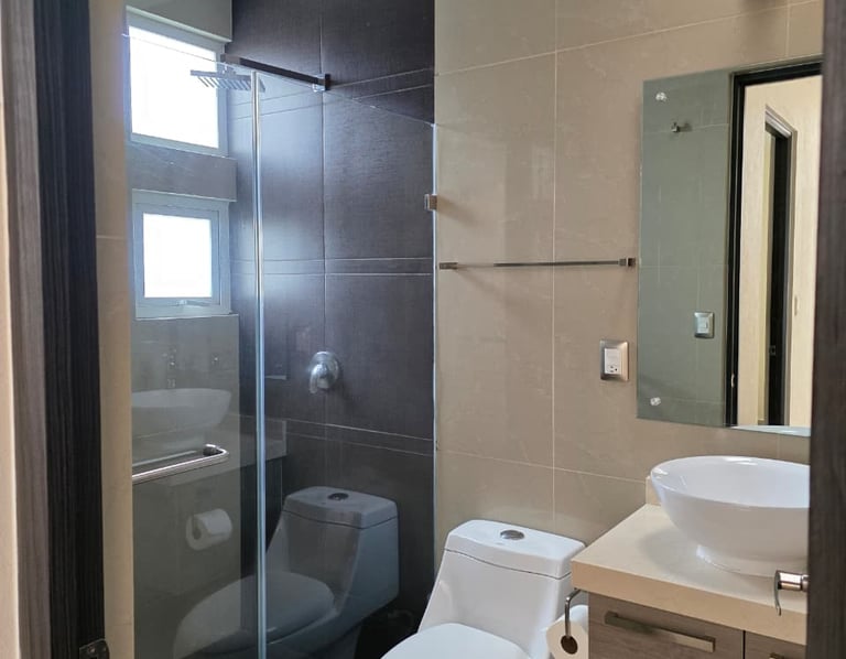 · Baño completo compartido, con barras de mármol y cancelería de vidrio templado, garantizando estilo y durabilidad.