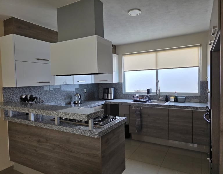 Barra de doble altura, ideal para desayunos o reuniones familiares.