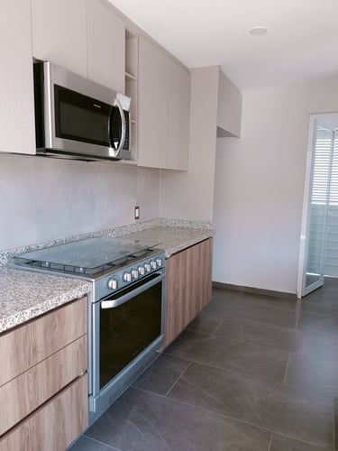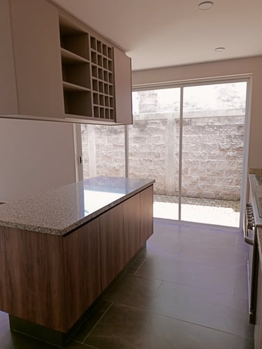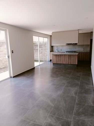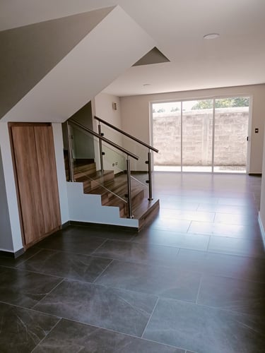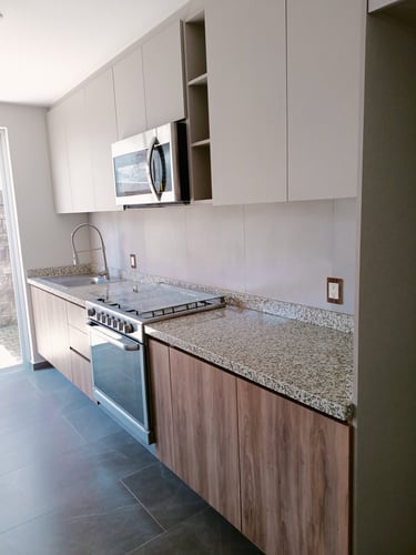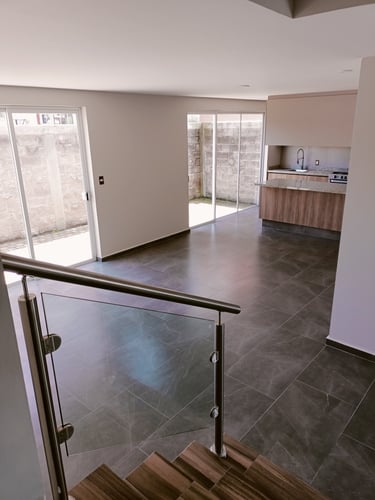 El nivel principal te recibe con un espacioso recibidor que da paso a la sala-comedor de concepto abierto, ideal para reuniones sociales y familiares. La cocina equipada con elegantes barras de granito combina diseño y practicidad, ofreciendo un área funcional para cocinar y disfrutar de comidas en familia. También encontrarás un medio baño para visitas, así como un patio privado y un área de servicio que facilitan las tareas del día a día. El estacionamiento para dos autos asegura comodidad y seguridad.