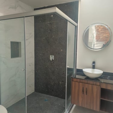 Los baños completos incluyen elegantes canceles de acero inoxidable y cristal templado.